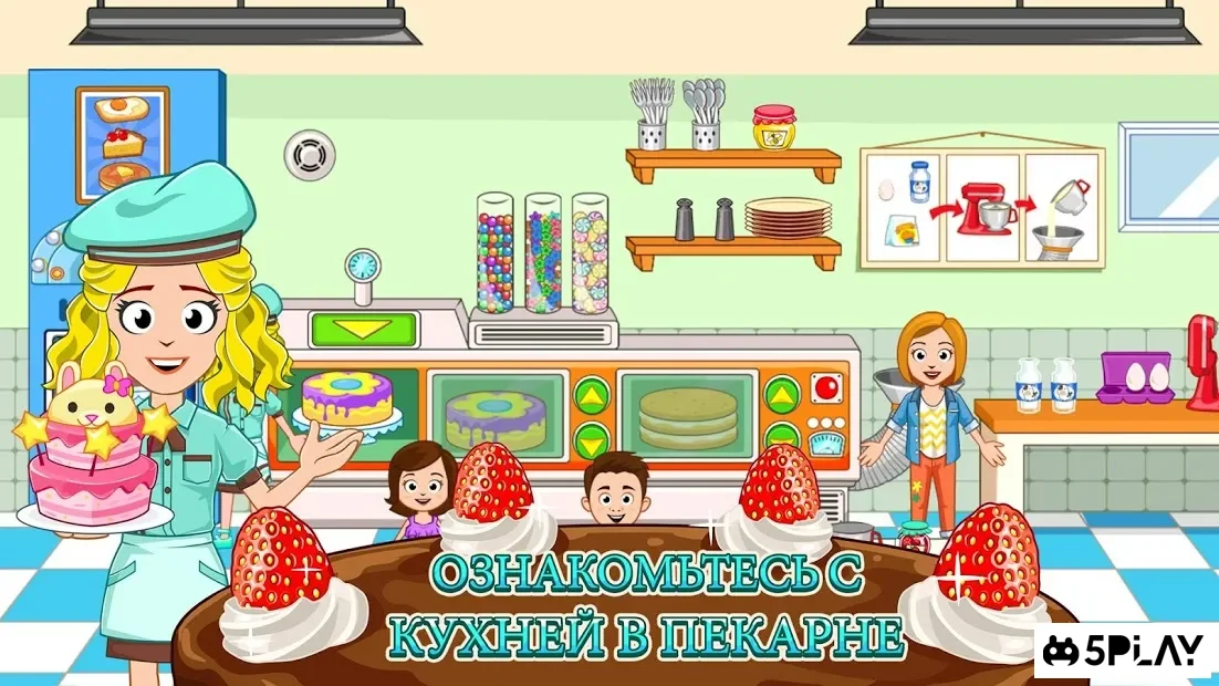 My Town : пекарня - обучающая игра для детей младшего школьного возраста на кулинарную тематику. Здесь юные пользователи смогут вновь встретиться со знакомыми героями из серии My Town, а также познакомятся с новыми персонажами. Вместе с ними игроки побывают на нескольких локациях, включая пекарню, пиццерию, парк для проведения торжественных мероприятий, апартаменты и др. В каждом месте необходимо будет готовить разнообразную пищу и подавать ее гостям и клиентам. Вся готовка станет проходить в игровой форме, которая поможет развивать полезные навыки ребенка.