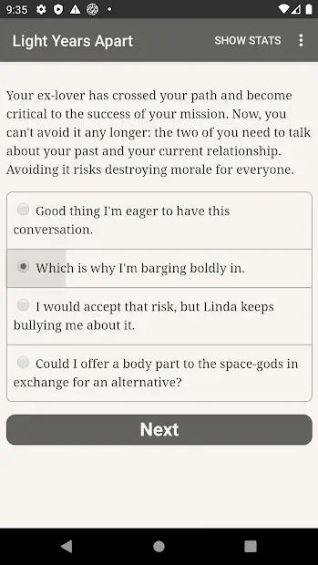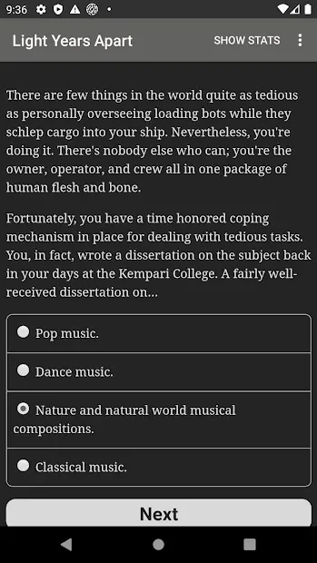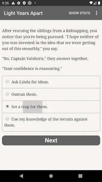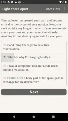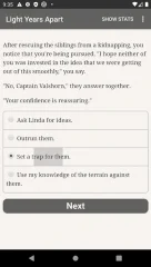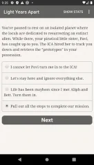 Light Years Apart - интерактивный роман с фантастическим сюжетом и несколькими вариантами развития событий. Игрок сможет ощутить себя в роли повстанца, борющегося со зловещей организацией. На протяжении всего повествования пользователю предстоит делать нелегкий выбор, который будет влиять на исход всего действия. Ситуации, в которые попадет заглавный персонаж, будут нетривиальными, потому от геймера потребуется четкое следование своему кодексу чести. В зависимости от выбранных действий персонаж сможет встать во главе восстания или же примкнет к угнетателям.