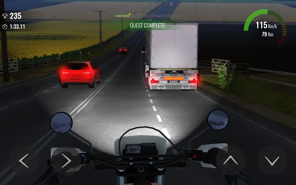 Moto Traffic Race 2 - симулятор, в котором пользователь сядет за руль мотоцикла и отправится гонять. Здесь доступно множество "железных коней", начиная от простых мопедов и заканчивая мощными байками. Также здесь имеется три игровых режима, в которых нужно выполнять различные квесты. За выполнение заданий гонщик будет получать вознаграждение, которое можно потратить на модернизацию имеющегося мотоцикла или покупку нового. Ездить придется на различных локациях и в разное время суток. Для успешной езды необходимо не только выбрать наиболее удобное управление, но и иметь хорошую реакцию и рефлексы.