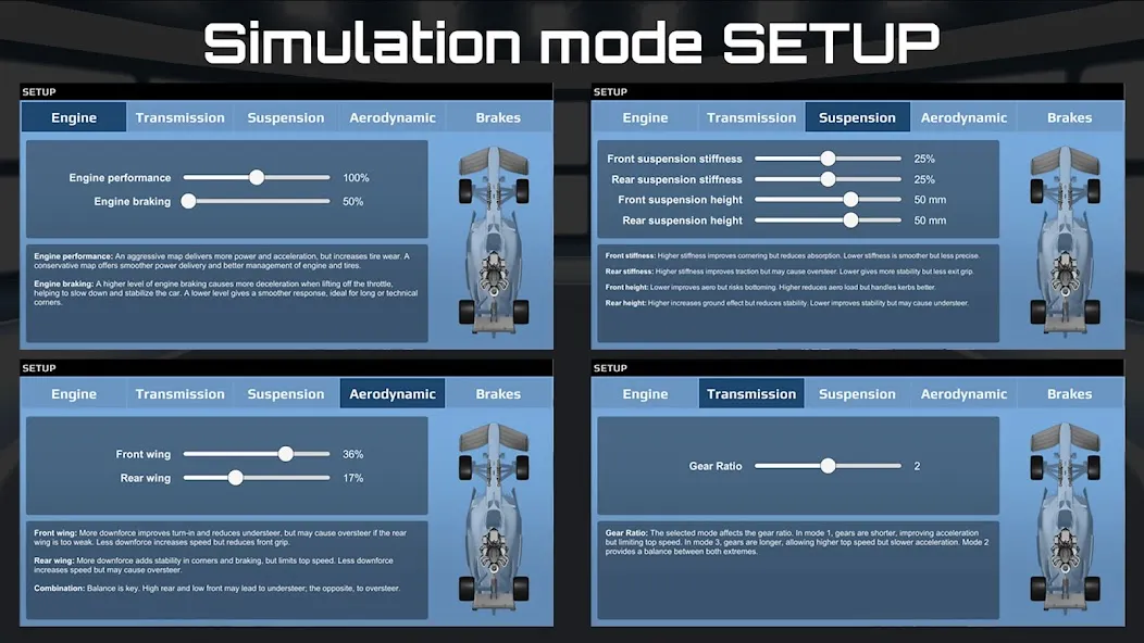 Fx Racer - гоночный симулятор, предлагающий игроку стать пилотом болида Формулы-1. Пользователь сможет сделать успешную карьеру гонщика, участвуя в соревнованиях на 18 трассах, расположенных по всему миру. Для достижения побед ему предстоит менять конфигурацию автомобиля для адаптации его к определенным условиям заезда. Также ему будет доступно более полусотни апгрейдов, дающих преимущество перед соперниками. Установить их можно, потратив призовые деньги, полученные за успешные гонки с достижением подиумов.