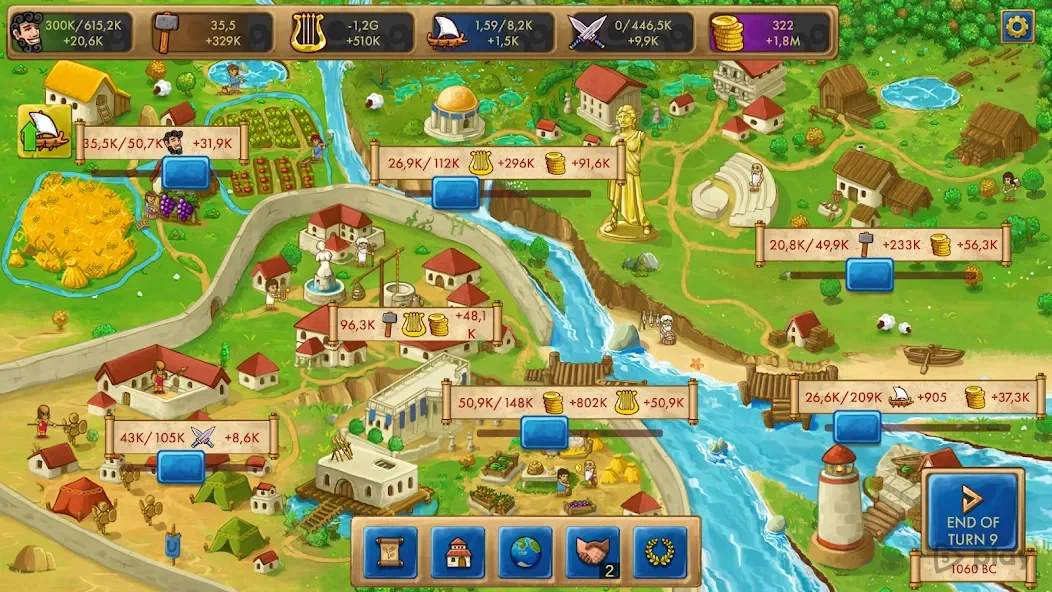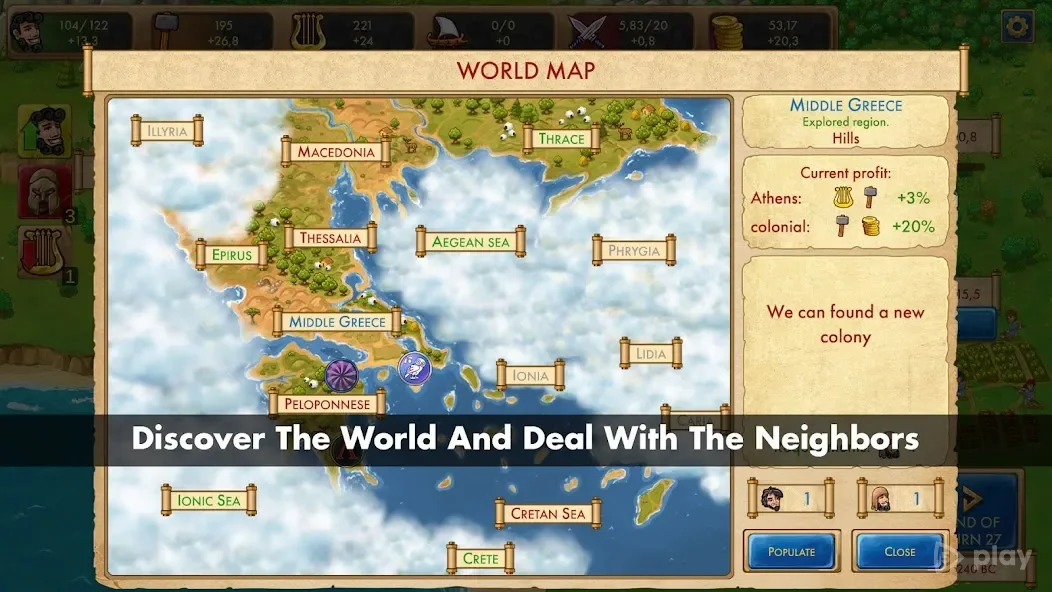 Marble Age Remastered - обновленная версия отличной стратегии, действие которой будет происходить на территории Древней Греции. Игрок станет правителем небольшого поселения и постепенно станет развивать его таким образом, чтобы оно стало ведущим полисом с огромным количеством жителей. Развитие будет происходить по нескольким критериям: правитель должен захватывать территории с помощью военных нападений, отражать атаки на свои владения, заключать дипломатические отношения с соседями, добывать ресурсы, совершенствовать технологии, противостоять природным катаклизмам. Все это сделает государство самым могущественным и влиятельным на континенте.