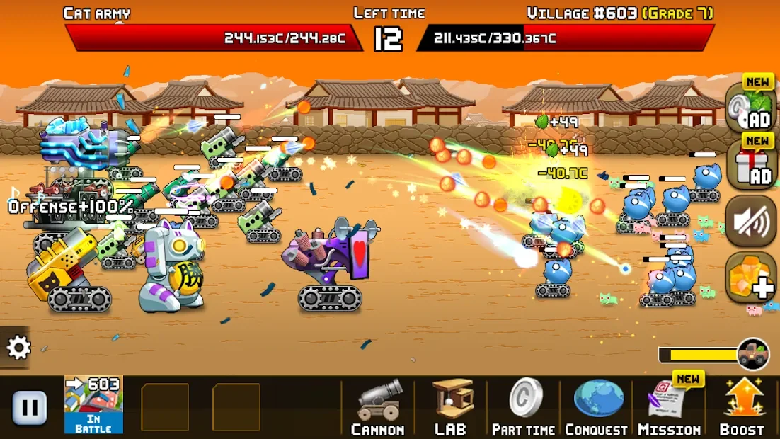 Idle Cat Cannon - фантастический экшн, в котором игрок будет противостоять взбунтовавшимся кибернетическим котам, желающим уничтожить человечество. В недалеком будущем люди столкнулись с тем, что роботизированные кошки постепенно стали захватывать территорию планеты, угрожая ей апокалипсисом. Для противостояния андроидам пользователь получит мощную армию, состоящую из различных боевых юнитов. Перемещаясь на поле боя, геймер станет управлять своими силами, наводя орудия на цели и устраняя наступающих неприятелей точными выстрелами.