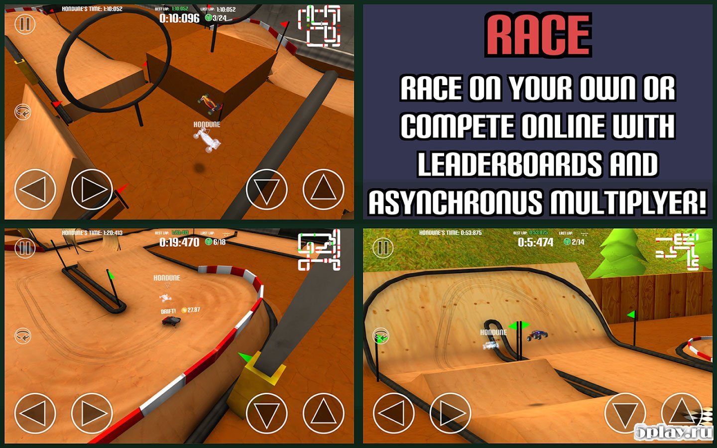 ReCharge RC - захватывающие гоночки на радиоуправляемых машинках. Здесь отсутствует режим одиночной игры, но имеется асинхронный мультиплеер. Игрок должен выбрать понравившийся трек и установить на нем рекорд. После этого результат загрузится в сеть, где другие пользователи смогут сравнить его со своим и попытаться побить. Проект имеет удобное управление, выбор из четырех авто и систему тюнинга. Характеристики у машин одинаковые и прокачать их нельзя. Зато любой гонщик сможет создать собственную карту с помощью редактора.