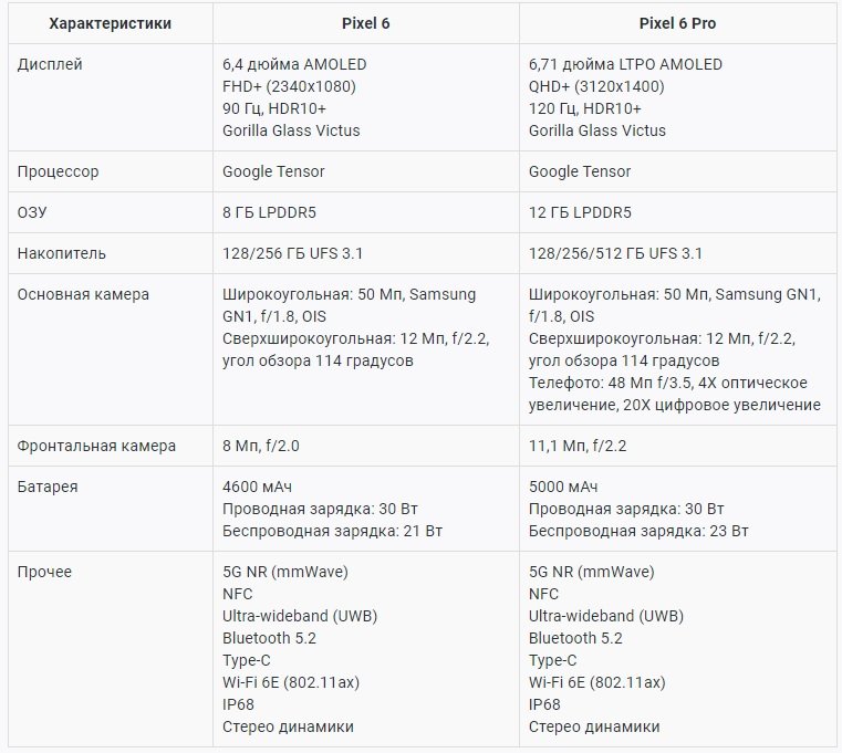 Объем ОЗУ для младшей и старшей версий составит 8 или 12 ГБ соответственно. Объем внутренней памяти в начальной конфигурации будет равен 128 ГБ, однако покупателям станут доступны и хранилища до 256 ГБ (Pixel 6) и до 512 ГБ (Pixel 6 Pro).