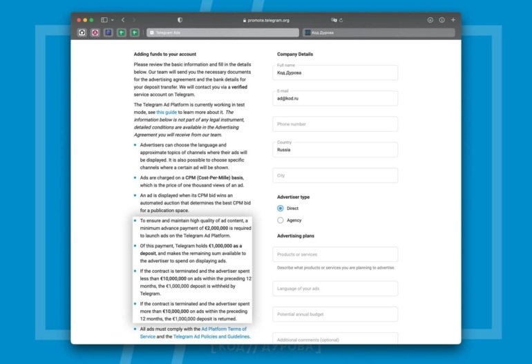На канале «Код Дурова» также был показан кабинет платформы, где была указана цена рекламы за тысячу показов в размере €2 и минимальный рекламный бюджет для запуска в размере €2 млн.
