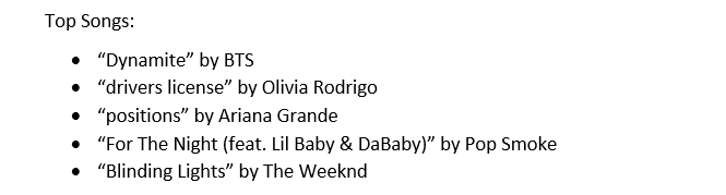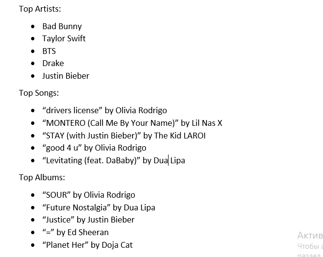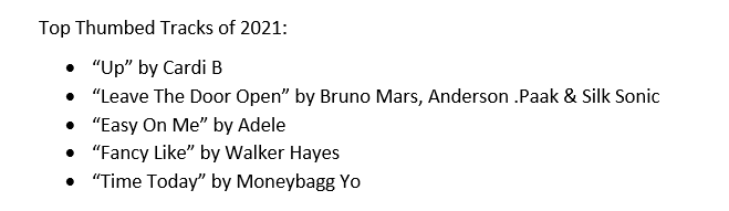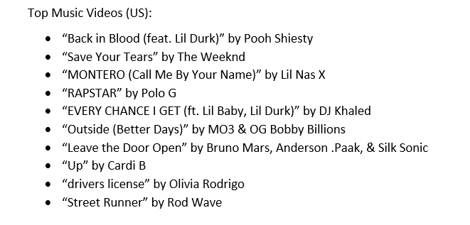 Согласно рейтингам, меломанам в особенности нравились композиции Olivia Rodrigo, BTS, Bad Bunny, Doja Cat и Pooh Shiesty. Но не обошлось и без некоторых сюрпризов.