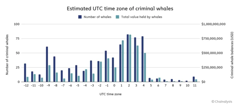 В процессе анализа специалисты также определили с помощью часовых поясов ориентировочное местоположение преступных «китов». В результате выяснилось, что больше всего подобных держателей кошельков находится в часовых поясах UTC +1, +2, +3, +4, -9. Данные пояса включают и некоторые территории России, в частности и крупные города – Москву и Санкт-Петербург. Вместе с тем в Chainalysis отмечают, что часовые пояса отображают лишь долготу, поэтому «киты» могут находиться и других странах, к примеру, в ЮАР, Саудовской Аравии или Иране.
