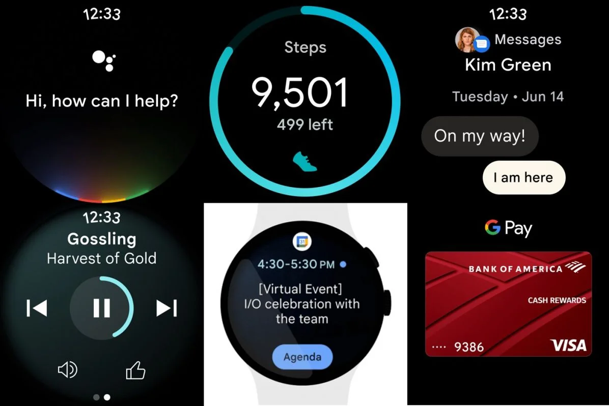 Помимо этого, часы будут поддерживать фирменный мессенджер «Сообщения», поскольку на скриншотах показан интерфейс приложения с аватаркой и именем пользователя, текущим временем и недавними сообщениями. Также на изображении видно главное меню, где можно создать новый чат или перейти в уже существующие. Предусмотрена работа часов с Google Pay, YouTube Music и Google Calendar, синхронизация с которым позволит отображать актуальные задачи и мероприятия, запланированные владельцем устройства.