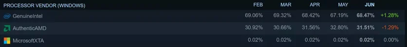 В июньском противостоянии процессоров Intel вновь смог обойти AMD, так как суммарное число чипов производителя увеличилось на 1,28%. Вероятно, данный показатель связан с выходом новых процессоров двенадцатого поколения Alder Lake. Любопытно, что месяцем ранее в данном рейтинге первенствовала именно AMD, но производитель получит шанс для возвращения утраченных позиций после релиза процессоров Raptor Lake на архитектуре Zen 4.