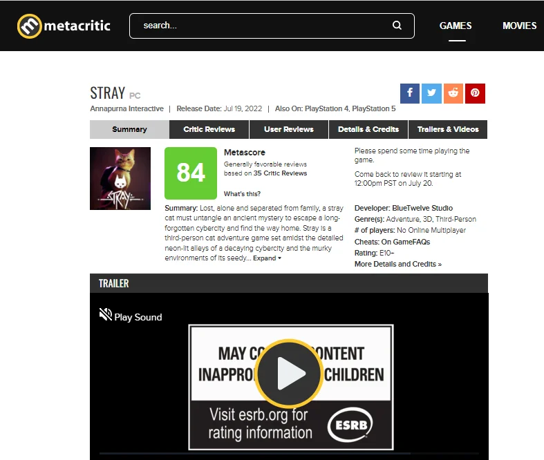 Stray – это симулятор жизни кота в сеттинге будущего в стилистике киберпанка. Игрок будет управлять котом, которому предстоит познать мир мрачного, но цветасто-неонового будущего. Игроки и эксперты в целом положительно оценили данный проект.
