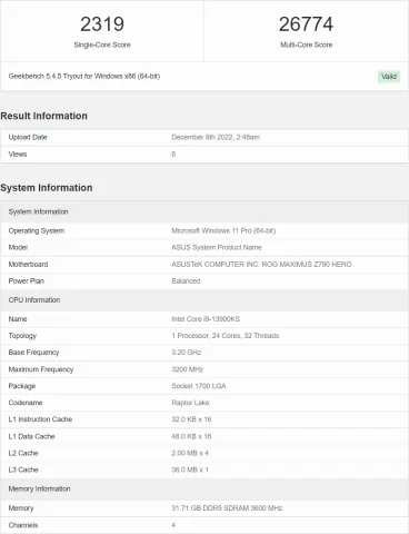 Наиболее производительная версия Core i9-13900 с приставкой KS засветилась в популярном бенчмарке. Основной особенностью процессора является рекордная тактовая частота из коробки.