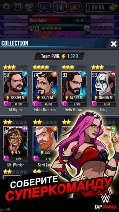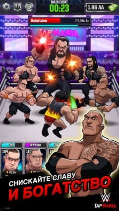 WWE Tap Mania - кликер, в котором игроки будут управлять командой настоящих рестлеров и сразятся на ринге с лучшими бойцами. Игровой процесс типичен для подобных проектов: нажимая на экран, пользователь будет наносить мощные удары по сопернику. Чем больше тапов по дисплею - тем больше синяков на лице оппонента. В конце концов он сменится ещё более сильным, поэтому придется проявить еще больше упорства для победы. В процессе прохождения откроются новые бойцы с уникальными способностями, которых стоит использовать на деле и брать верх над любым противником.