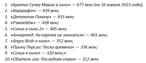 В десятку наиболее кассовых экранизаций игр сейчас входят такие фильмы, как: