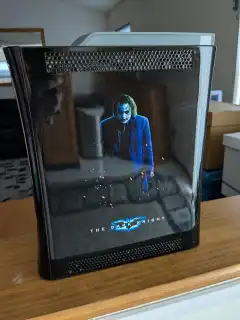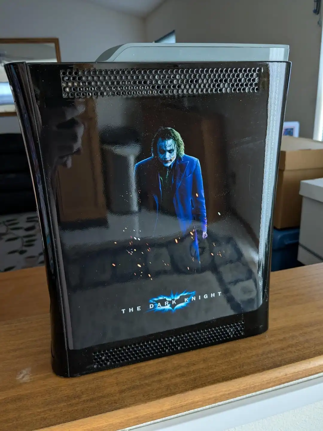 Коллекционеры игровых консолей обратили внимание на появление в сети одного из самых редких экземпляров Xbox 360, выполненного в стилистике культового фильма Кристофера Нолана "Тёмный рыцарь". Уникальное устройство с изображением Джокера в исполнении Хита Леджера и логотипом картины было выпущено ограниченным тиражом в 150 штук в 2008 году в результате сотрудничества Microsoft, Warner Bros. и сети пиццерий Domino's.