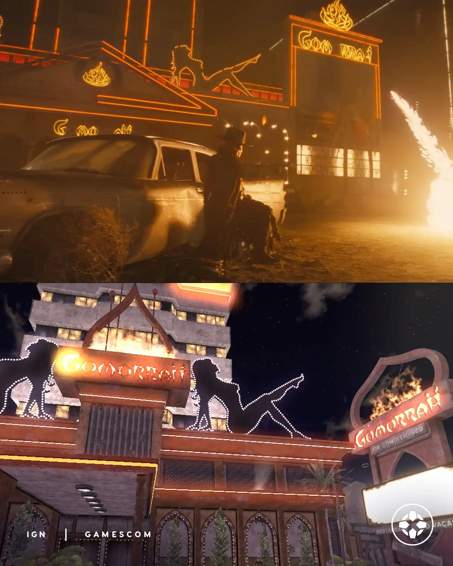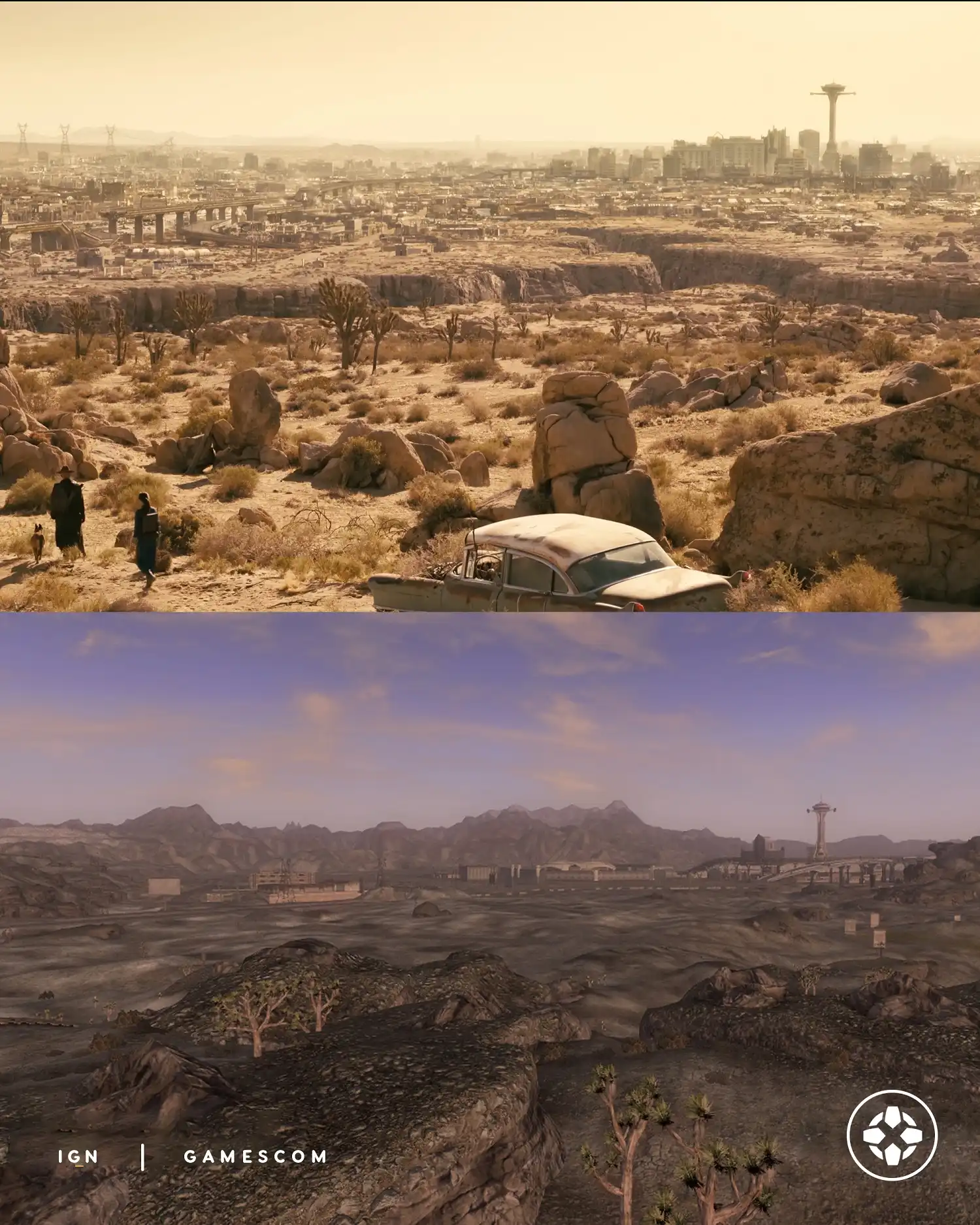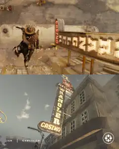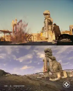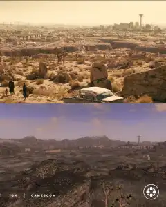 После выхода трейлера 2-го сезона шоу Fallout поклонники франшизы начали детальное сравнение визуального представления Нью-Вегаса с оригинальной игрой Fallout: New Vegas. Кадры демонстрируют значительно преображенный город — добавлены новые здания, растения и каньоны, хотя ключевая достопримечательность в виде башни-казино сохранила свой узнаваемый силуэт. Визуальный стиль напоминает модифицированную версию игры или современный ремейк, что особенно заметно по обогащенному ландшафту окружающей пустоши.