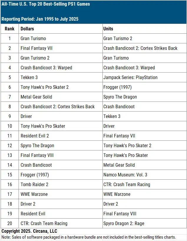 Юбилей PlayStation стал поводом для публикации аналитического отчёта Circana, в котором собраны данные о самых успешных проектах за три десятилетия существования бренда. Исследование включает два рейтинга: общий список лидеров на всех поколениях консолей и отдельный топ игр, которые пользовались наибольшей популярностью на оригинальной PlayStation.