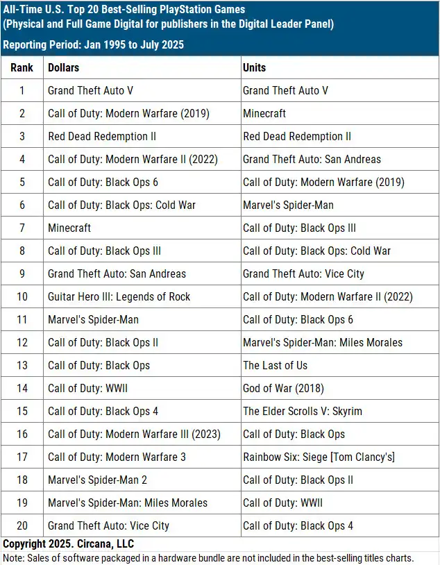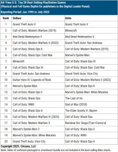 Главным хитом всей истории платформы стала Grand Theft Auto V, в то время как значительную часть общего чарта заняли различные части Call of Duty. Среди эксклюзивов PlayStation выше всех поднялся Marvel’s Spider-Man, оказавшийся на шестом месте по количеству проданных копий и на одиннадцатой позиции по общей выручке.