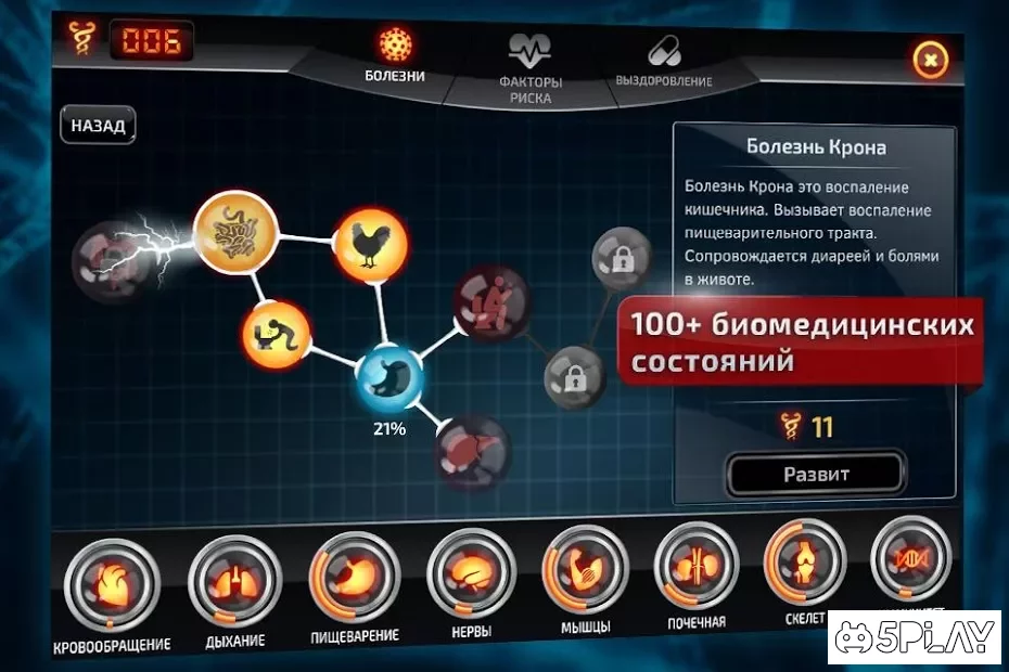 Посредством зарабатываемых очков можно открывать новые болезни. При выборе потенциального пациента нужно учитывать специфику и привычки его организма. В особых случаях человек просто-напросто окажется не подвержен той или иной болячке. Часто своё веское слово вставляет иммунитет, не позволяющий болезни развиться. Bio Inc. - Biomedical Plague - нетривиальная стратегия, способная завлечь в свой игровой процесс надолго.