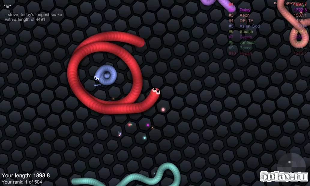 slither io вам доступен только небольшой червячок. Он начинает увеличиваться в размерах, поедая цветные шарики, разбросанные по виртуальному пространству. При встрече с конкурентами перед вами неизбежно возникнет искушение перекусить ими, как во многих других подобных играх. Однако это будет крайне опрометчивым решением. Здесь проигравшим становится тот, кто сталкивается с питомцем другого пользователя. Будь ваша змея размером хоть с анаконду, она неизбежно погибнет при встрече с любым другим персонажем, оставив после себя только обилие съедобных шариков.