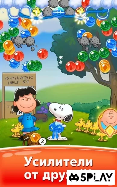 Snoopy Pop - забавная аркадная игра с псом Снупи в главной роли. В ней игрок будет помогать персонажу взрывать разноцветные пузырьки. Используя меткость и скорость, пользователь начнет разрывать пузыри и освобождать попавших в ловушку птиц. Здесь необходимо стрелять так, чтобы за один выстрел уничтожилось максимальное количество цветных сфер. Таким образом геймер будет проходить уровни один за другим, освобождая пернатых. Всего здесь имеется более сотни этапов, за прохождение которых предусмотрены различные бонусы и усиления.