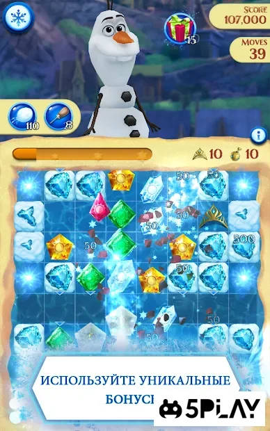 Дружелюбный олень Свен и снеговик Олаф развеселят вас своими незамысловатыми и очень смешными лицами, даря легкое, непринужденное настроение. В зависимости от персонажа, с каждым уровнем в