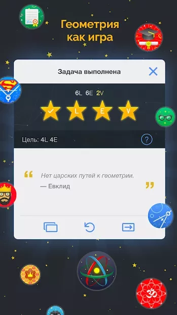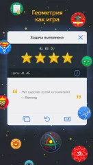 головоломка на геометрическую тематику. Данный проект придется по душе как изучающим данную дисциплину, так и простым любителям жанра. В этой игре пользователь станет решать различные задачи и продвигаться вперёд с помощью построений различных фигур посредством линейки и циркуля. Каждый новый уровень будет требовать использования уже полученных на прошлых этапах знаний. При этом уровень сложности непременно растет, а сам игровой процесс становится все более интересным.