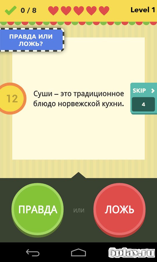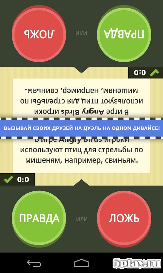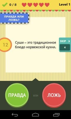 Правда или ложь на андроид - это увлекательная викторина, в которой пользователю необходимо отвечать на интересные вопросы, угадывая достоверность или ее отсутствие того или иного факта, представленного на экране.