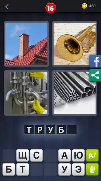 Для верного решения головоломки нужно сложить некий ассоциативный ряд и понять, что же на самом деле объединяет изображения. Но порой это достаточно сложно и кажется, что картинки абсолютно несовместимы друг с другом. В таких ситуациях как нельзя кстати придутся подсказки, предусмотренные разработчиками. Кстати, число букв в угадываемом слове известно заранее, и это тоже станет своеобразной помощью.