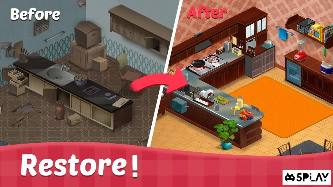 головоломка "3 в ряд" с сюжетом, согласно которому пользователь будет помогать главным героям обустраивать дом и приусадебный участок. Семья милых персонажей прибывает в свой дом, который находится в некотором запустении. Игроку нужно помочь им справиться с трудностями и обустроить домашний очаг. Для этого необходимо проходить уровни со знакомой геймплейной механикой. За прохождение каждого этапа можно получить неплохую сумму денег и пустить ее на приобретение каких-либо предметов для дома или же на его ремонт.