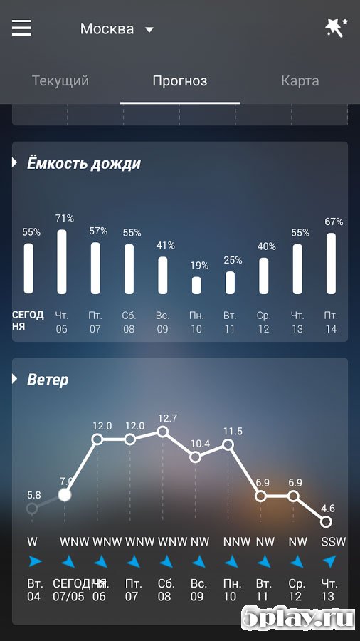 Данные достаточно подробны и содержат дату и время, максимальную и минимальную температуры, скорость и направление ветра и другую информацию. Для большего удобства предусмотрена функция просмотра прогноза по нескольким городам. Это оценят любители путешествий, которые не в силах усидеть на месте.