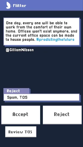 Flitter Inc. - приключенческий проект для Андроид. Действие игры происходит в начале 80-х годов ХХ века. Игрок возьмет на себя роль организации, изучающей передовые технологии. Основной обязанностью пользователя является наблюдение за микро-платформой сообщений, а именно нужно делать так, чтобы тексты посланий были дружелюбными и не содержали спама. Геймеры будут лишь винтиками огромной системы и смогут раскрыть все загадки этого мира.