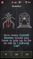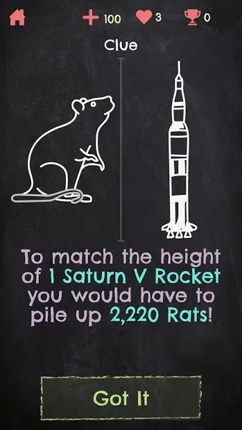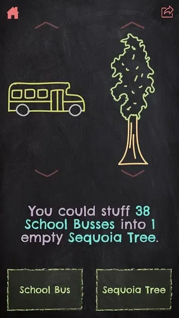 Cramble - оригинальная викторина, в которой пользователь проверит свою сообразительность и сможет похвастаться своими умениями перед друзьями. Игровой процесс здесь достаточно прост: на экран выводится вопрос о том, какое количество одних предметов может поместиться в другом. К примеру, сколько школьных автобусов вместит в себя гигантская секвойя. Чтобы ответить на вопрос, игрок должен будет выбрать один из нижеприведённых вариантов ответов. В случае выбора верного ключа геймер получит определенное количество очков и пройдет дальше.