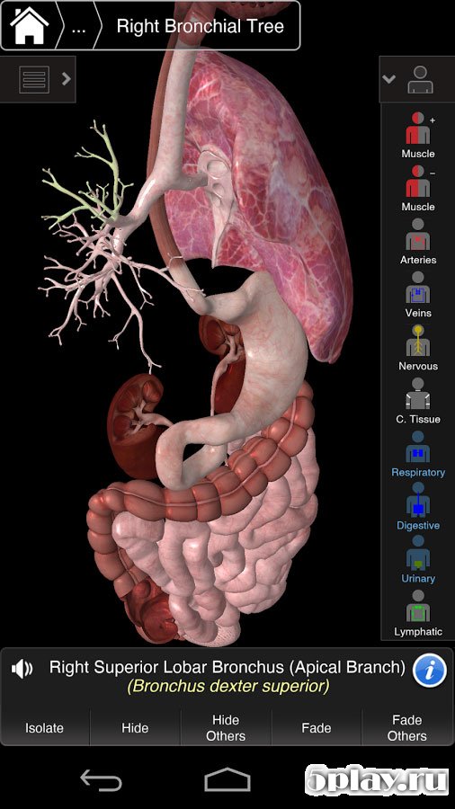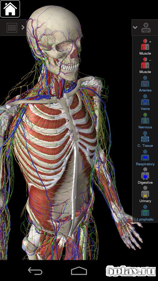 Essential Anatomy 3 - это замечательное приложение, разработанное под андроид, как нельзя лучше подходит для изучения анатомии. В нем много функций, позволяющих детально рассмотреть модель. Всего представлено 10 систем организма человека, среди которых есть костная, мышечная, ткани, вены и артерии.