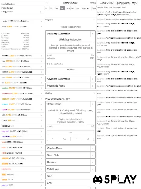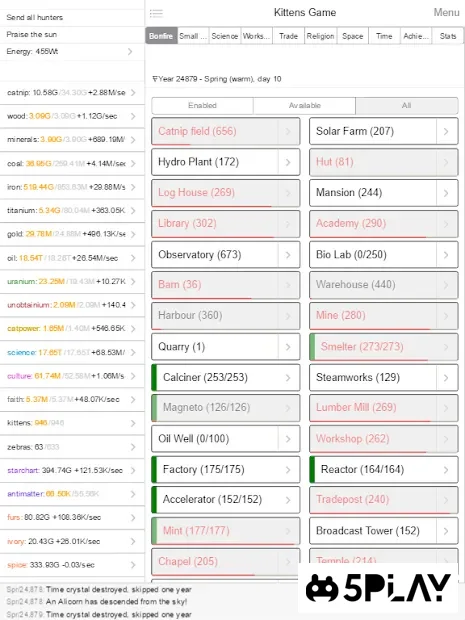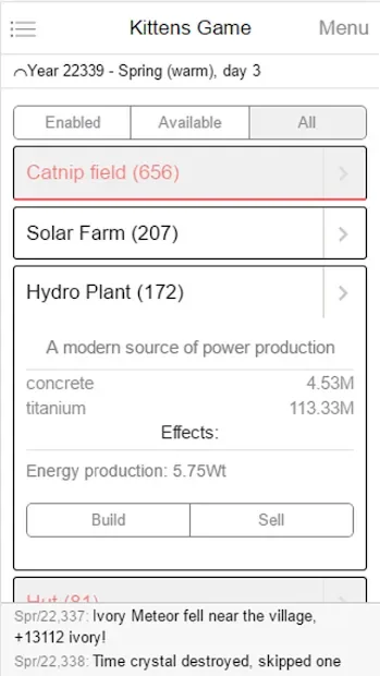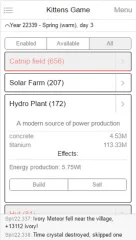 Kittens Game - текстовая стратегия, которая заставит игрока провести перед экраном мобильного устройства долгое время. Данный проект предлагает пользователям поуправлять деревней котят. При этом тут напрочь отсутствует какая-либо графика, все нужные данные подаются в виде текстов. Из них геймер сможет узнать количество доступных ресурсов и других необходимых для функционирования кошачьего поселения компонентов. На первых порах будет немного непривычно, однако в дальнейшем геймплей захлестнет пользователя с головой.