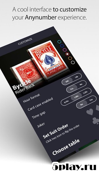 Anynumber- развлекательное приложение, которое обязательно вызовет "вау-эффект" у многих пользователей. Данная программа способна разгадать карту, которую загадал человек. Для начала необходимо написать на листе масть и значение карты, а также число от 1 до 52, который будет обозначать номер карты в колоде. Далее в приложении необходимо пролистать загаданное количество карт. Невероятно, но во всех случаях загаданная карта будет отгадана. Для этого используются специальные алгоритмы, но не применяются системы опознавания голоса, сканирование и другие программные и технические инструменты. В любом случае программа способна вызвать неподдельные эмоции у всех.