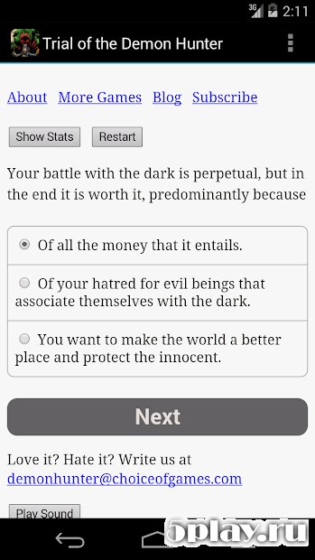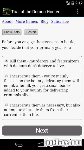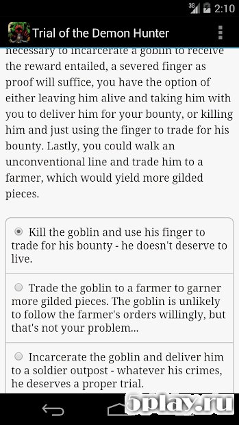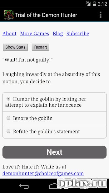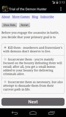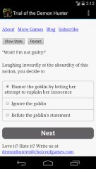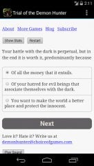 Trial of the Demon Hunter - интерактивный фэнтези-роман с захватывающим сюжетом. В нем игрок будет сражаться с демоническими силами, которые напали на деревню и грозятся уничтожить ее жителей. Чтобы разобраться с тьмой, окутавшей поселение, пользователь должен будет заручиться поддержкой напарника. В процессе прохождения геймер будет встречать ведьм, демонов и другую нечисть, которую нужно победить. Все действия развернутся в форме текстов, в которых нужно будет выбрать правильное решение для спасения деревни.