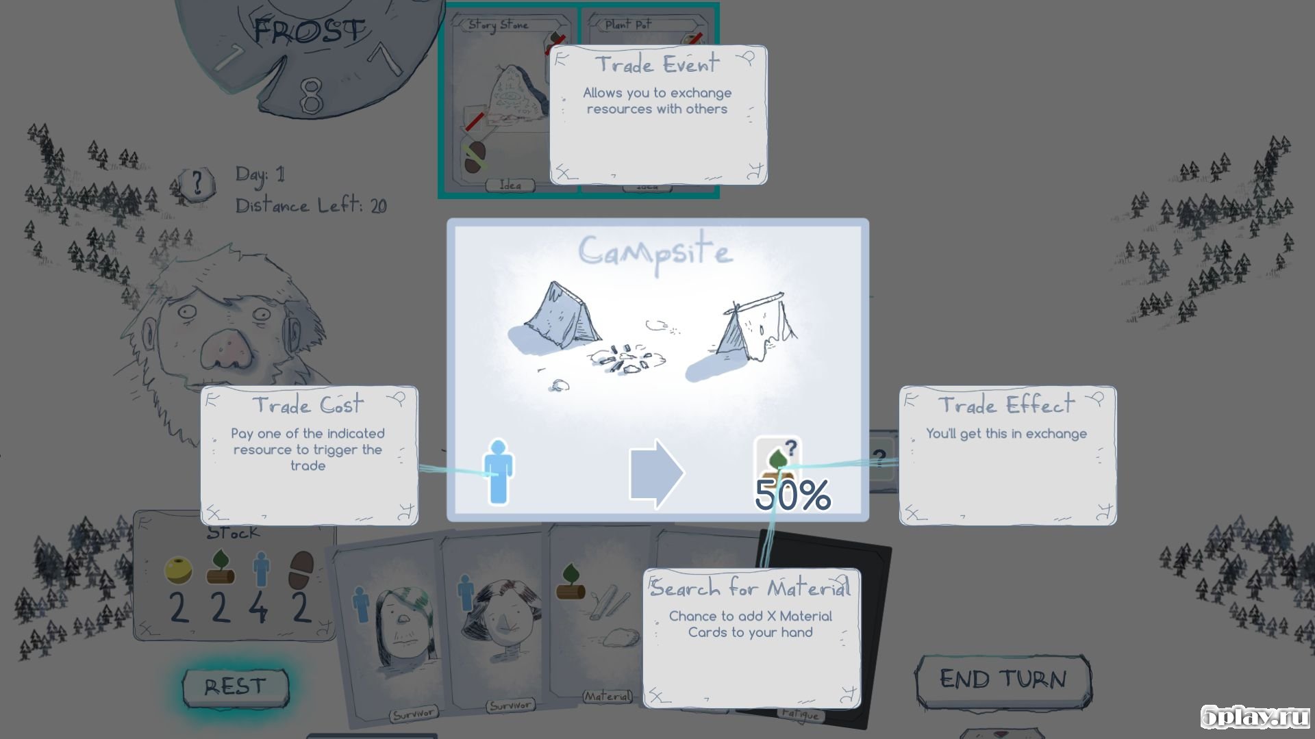 Frost - необычный проект про выживание с оригинальным геймплеем. Повествование разворачивается в мире, пережившем глобальный катаклизм, из-за чего везде выпало много снега и стало холодно. В таких условиях пользователям предстоит оставаться в живых. Для этого необходимо применять имеющиеся вещи и полезные предметы. Главной особенностью здесь является то, что игровой процесс представлен в качестве настольной карточной коллекционной игры. Такой подход разработчиков понравится любителям необычных проектов и подарит им новый игровой опыт.
