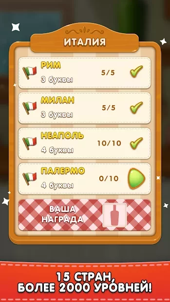 головоломка, в которой пользователь будет играть за шеф-повара, путешествующего по миру. В процессе своего путешествия он станет готовить вкуснейшую пиццу и радовать этим блюдом жителей разных стран. Игровой процесс заключается в том, что геймер должен помогать герою в его деле разгадыванием слов. Каждая буква располагается вокруг пиццы, и для получения положительного результата нужно расположить символы в правильном порядке. Всего игрока ожидает более двух тысяч интересных уровней в пятнадцати странах планеты.