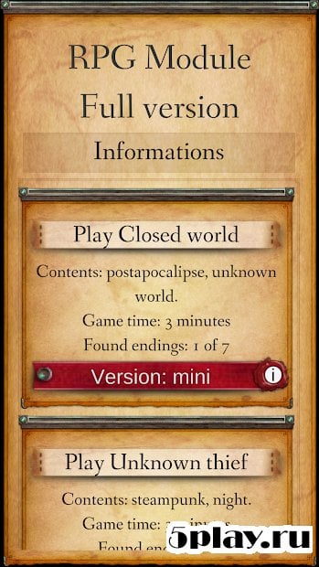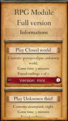 RPG Module Full - интерактивная ролевая игра, в которой игрок окажется главным героем одной из шести увлекательных историй. Пользователь будет взаимодействовать со множеством встреченных персонажей, среди которых будут солдаты, путешественники, преступники, гоблины и прочие колоритные герои. Действие каждой истории разворачивается в определенный временной период или в мирах с особым общественным и технологическим укладом. Так, геймер сможет оказаться в мире киберпанка или во времена великих географических открытий. В любом случае от действий пользователя будет зависеть течение сюжета каждой истории.
