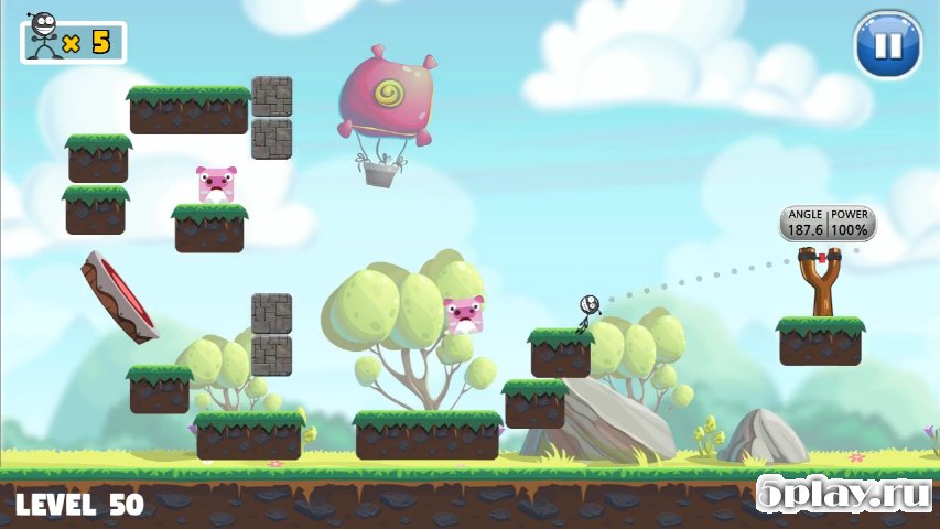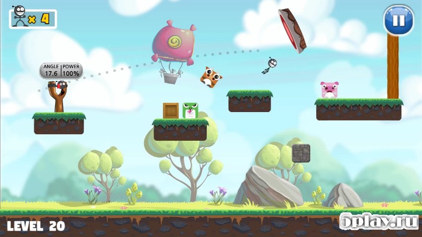 головоломка со знакомым геймплеем и забавными героями. Пользователь будет стрелять из рогатки в угловатых животных, а в качестве снаряда здесь предстоит использовать тонкого человека Стикмана. На каждом уровне игроку предоставится несколько попыток, чтобы сбить зверьков. Некоторые из них будут находиться в недоступных местах, поэтому для выполнения задачи потребуется использование деревянных балок и батутов в качестве поверхностей для рикошета. Удачный подбор силы и направления обеспечит попадание в цель и проход на следующий уровень.