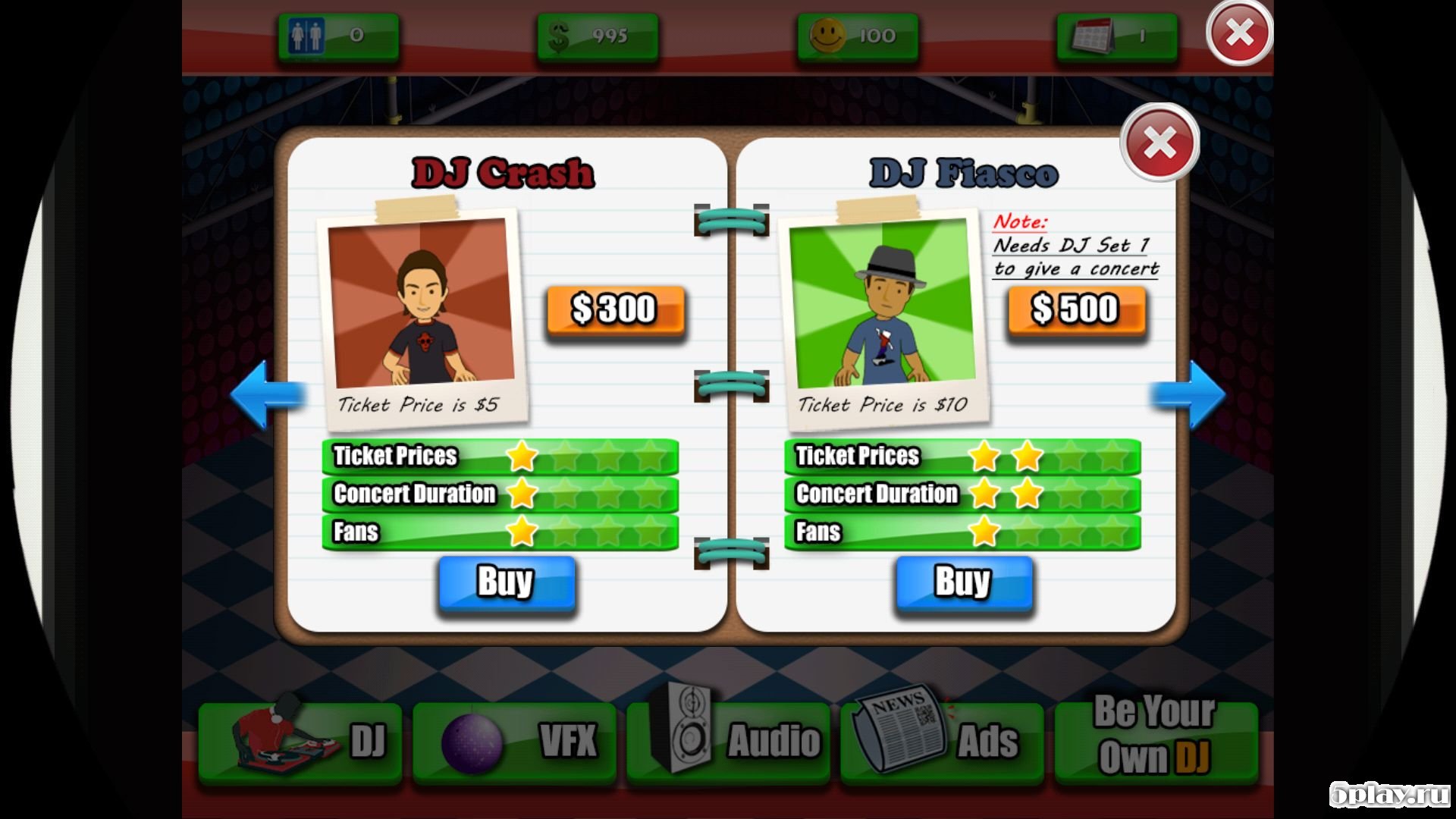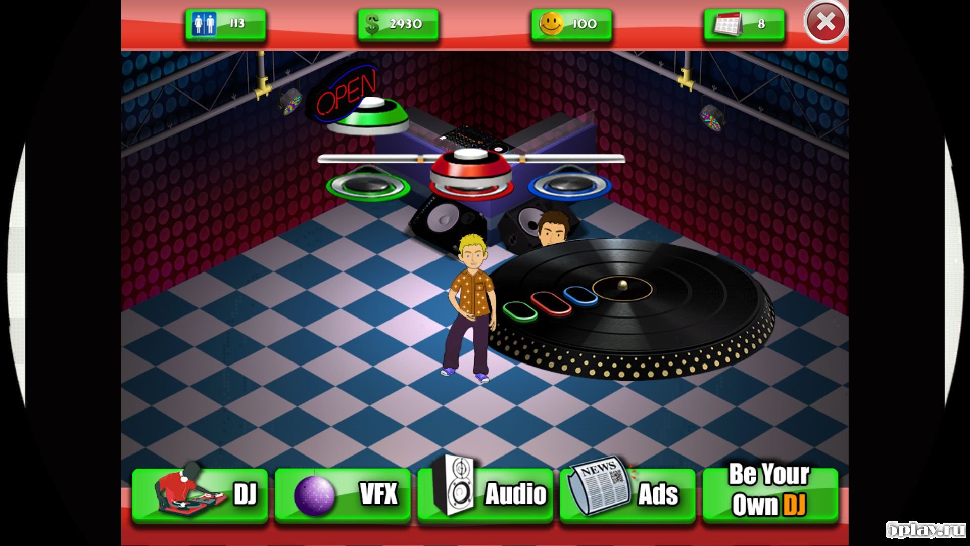 Club Dj Game - симулятор владельца ночного клуба для Андроид. Игрок сможет попробовать свои силы в этой интересной деятельности. Чтобы добиться успеха и прибыли, необходимо планомерно развивать заведение и сделать его одним из лучших в городе. Для этого пользователь должен нанимать лучших диджеев, приобретать для них самую крутую технику, красиво оформлять танцпол с помощью светового оборудования и привлекать гостей. Основной сложностью здесь являются сроки, за которые нужно выйти на положительный баланс, ведь сделать это нужно буквально за месяц.